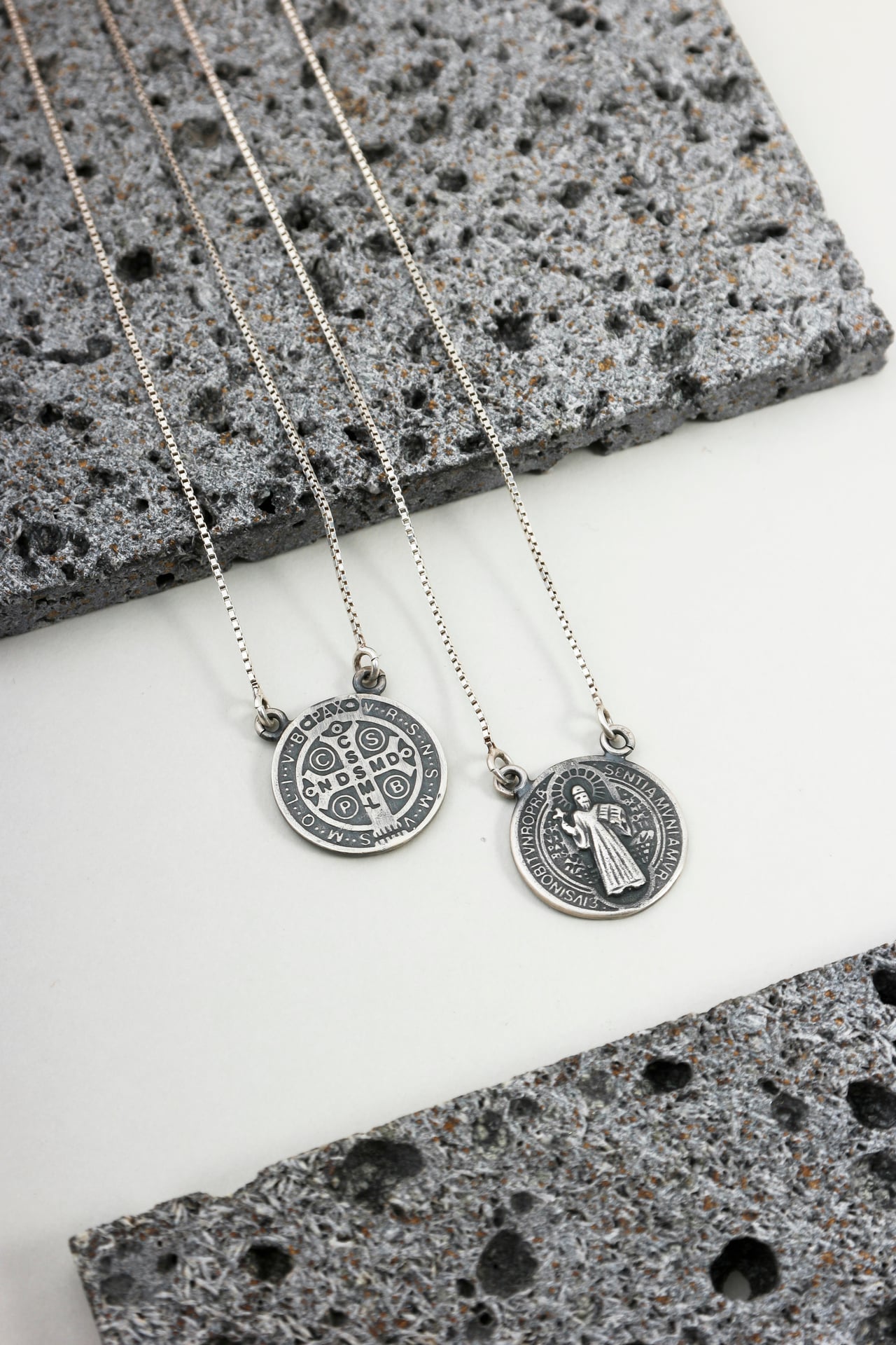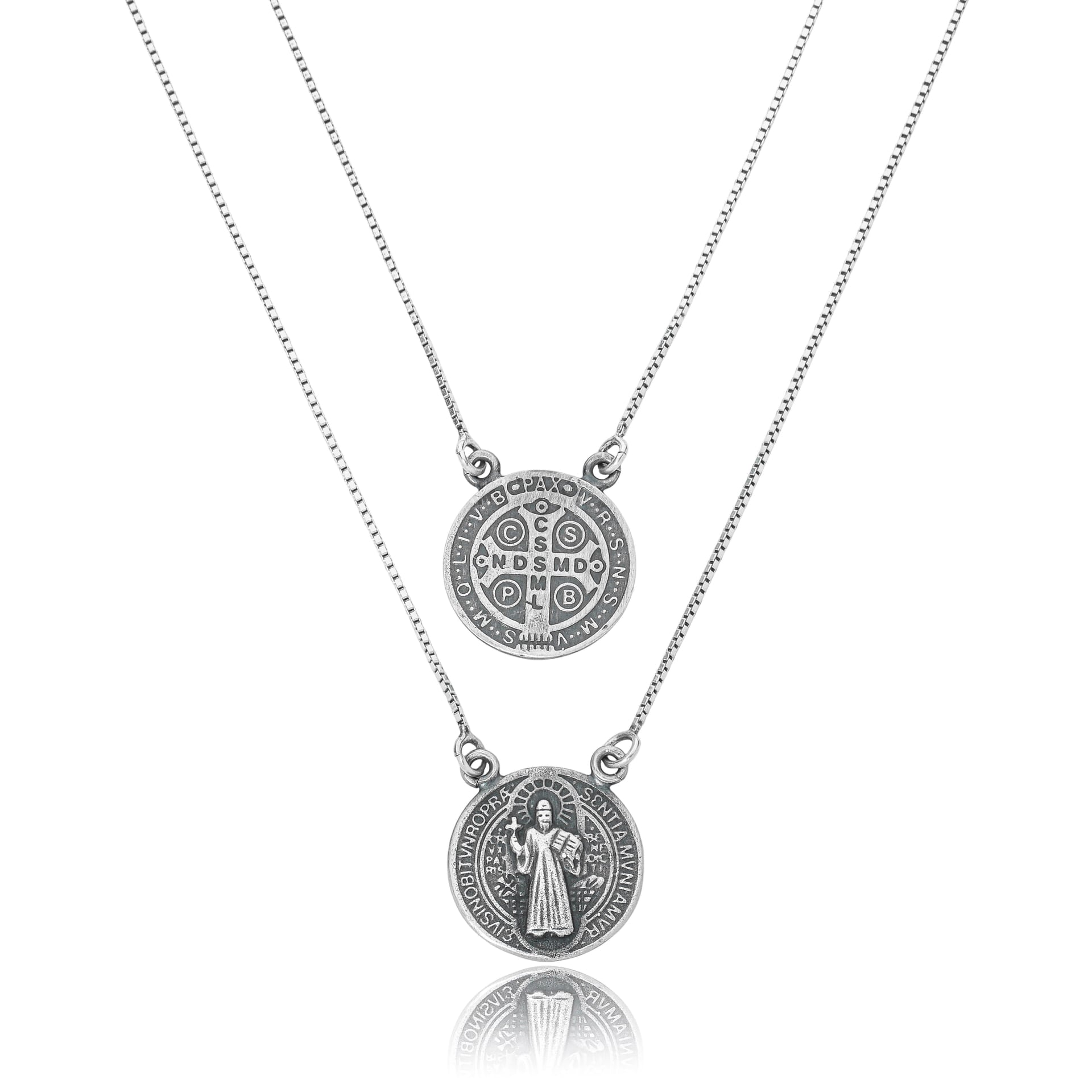 Um poderoso símbolo de fé e proteção em sua forma mais tradicional. Este escapulário em Prata 925 é inteiramente dedicado à Medalha de São Bento, com detalhes realçados pelo acabamento oxidado que conferem profundidade e significado à joia.