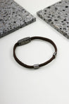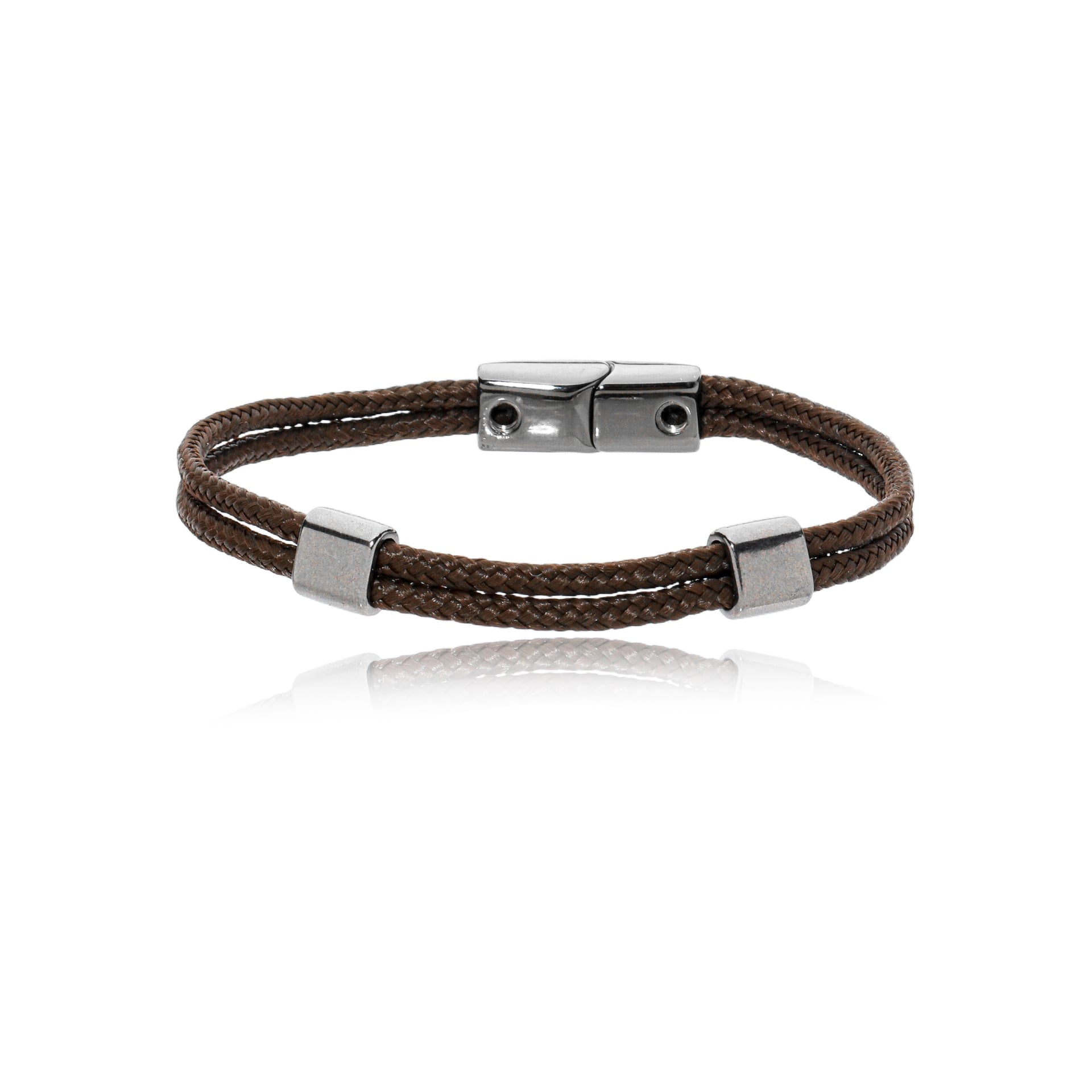 Um clássico atemporal, rico em texturas e detalhes. Esta pulseira de couro trançado marrom se destaca pelo contraste sofisticado de acabamentos no metal, unindo o clássico e o moderno. É o acessório perfeito para quem valoriza a elegância discreta.