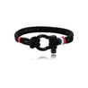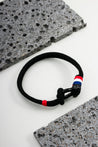 O design náutico clássico encontra uma estética urbana e sofisticada. Esta pulseira combina a robustez da corda preta e do fecho de manilha com o toque de cor do detalhe tricolor, criando um acessório versátil e cheio de personalidade.