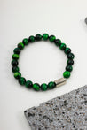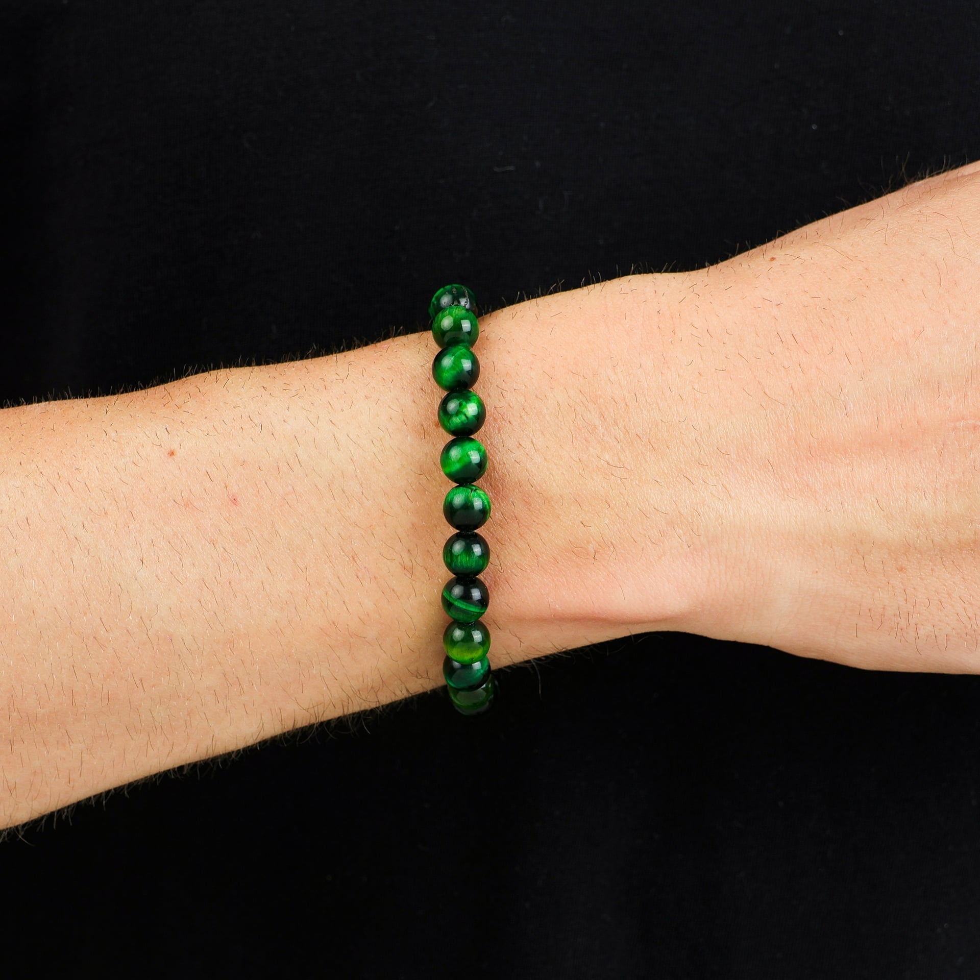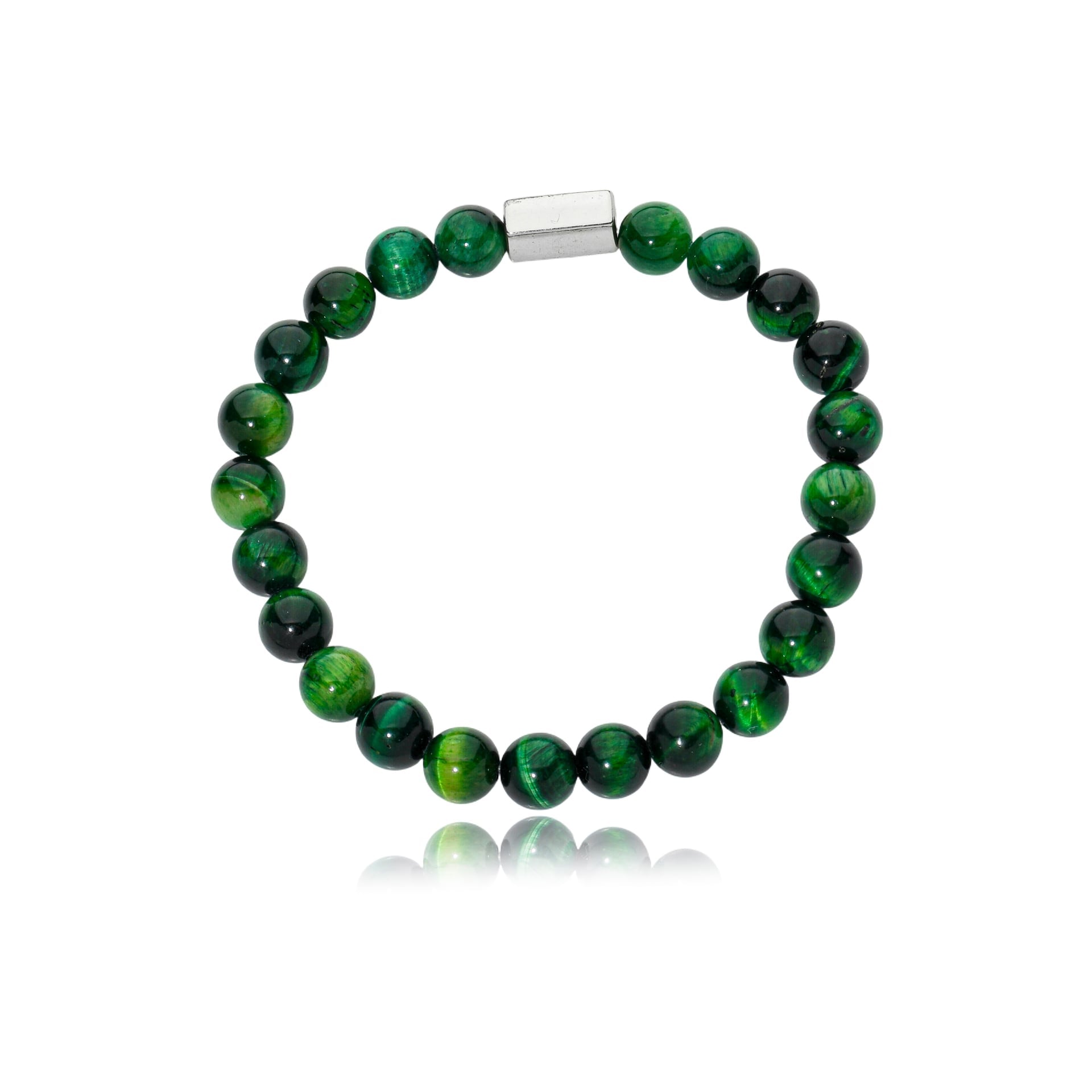Uma joia de cor e magnetismo inconfundíveis. Esta pulseira realça a beleza da pedra Olho de Tigre com um profundo tom de verde esmeralda, mantendo seu efeito óptico que captura a luz. É a escolha ideal para o homem que busca um acessório sofisticado e com forte personalidade.