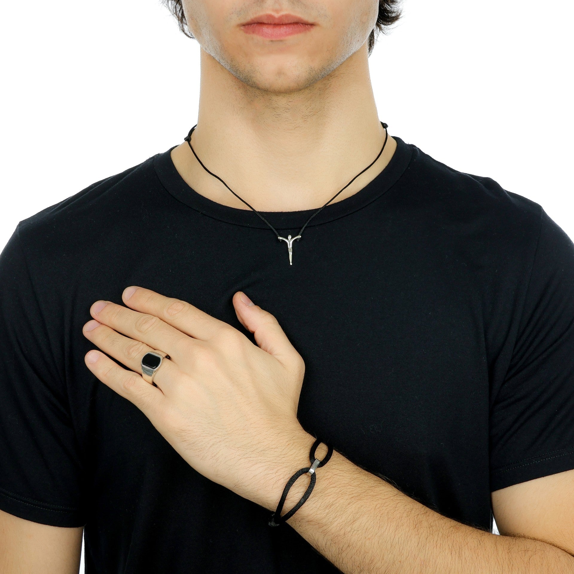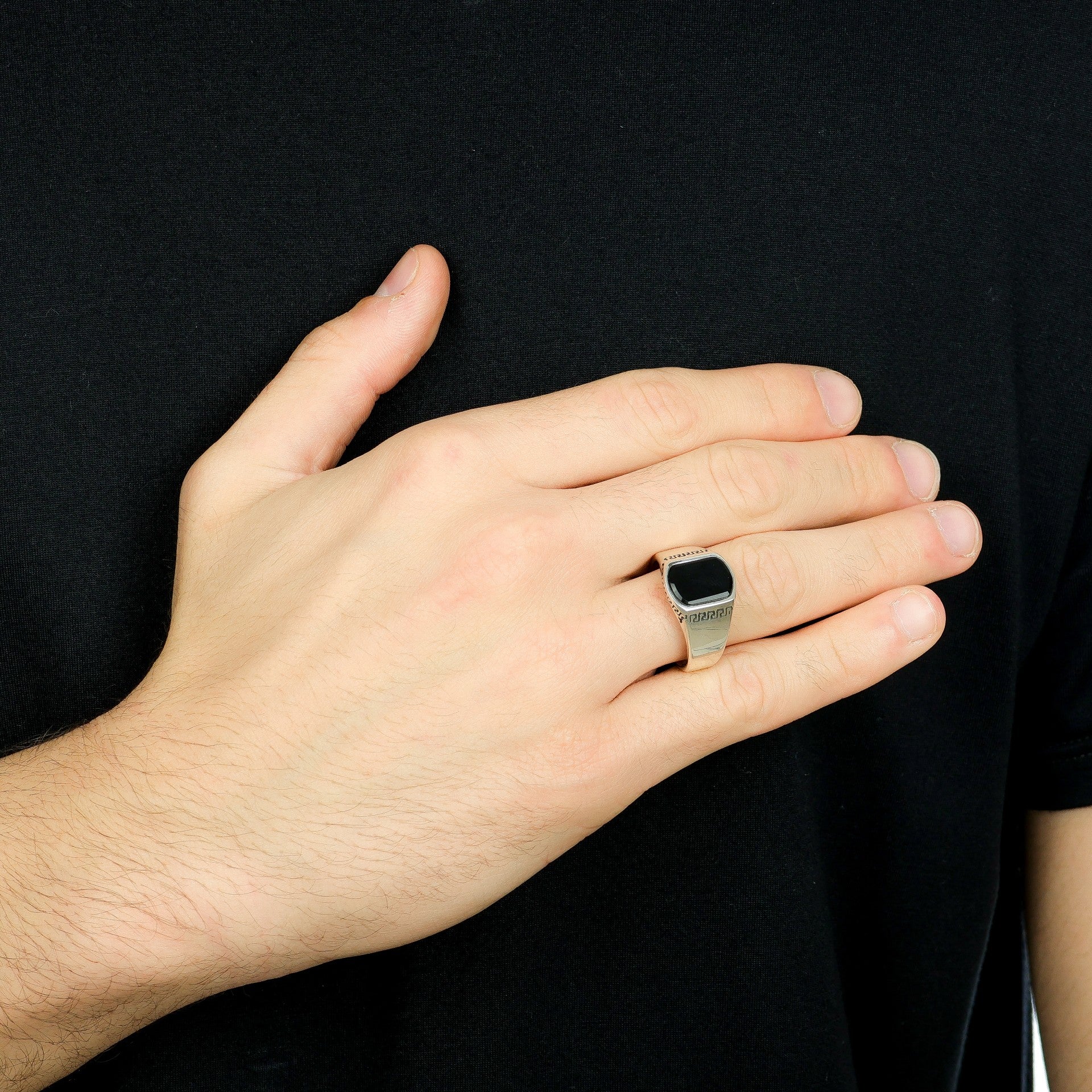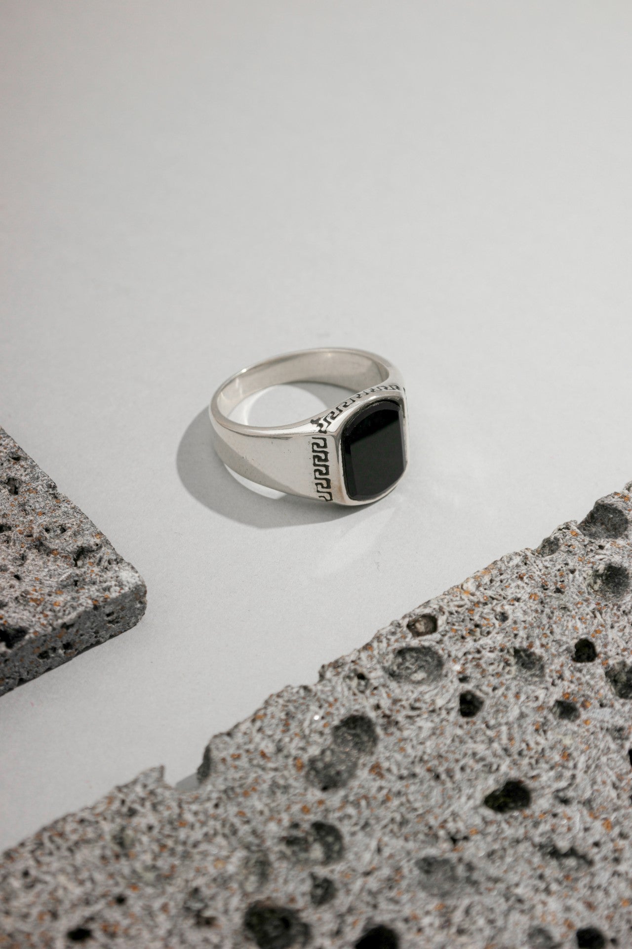 A união da história com o estilo contemporâneo. Este anel sinete combina a elegância da pedra Ônix com o clássico padrão grego nas laterais, criando uma peça de presença marcante e sofisticação arquitetônica.