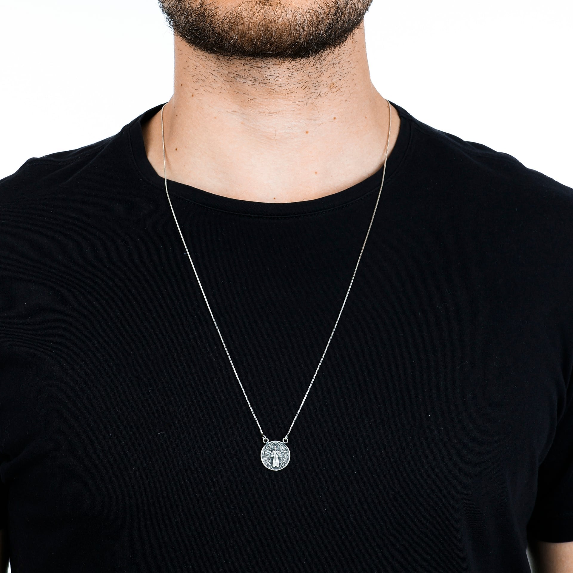 A fé e a proteção da Medalha de São Bento em um design clean e contemporâneo. Este colar se destaca pelo acabamento espelhado do Aço Cirúrgico, que oferece uma interpretação moderna e sofisticada a este poderoso símbolo de devoção.