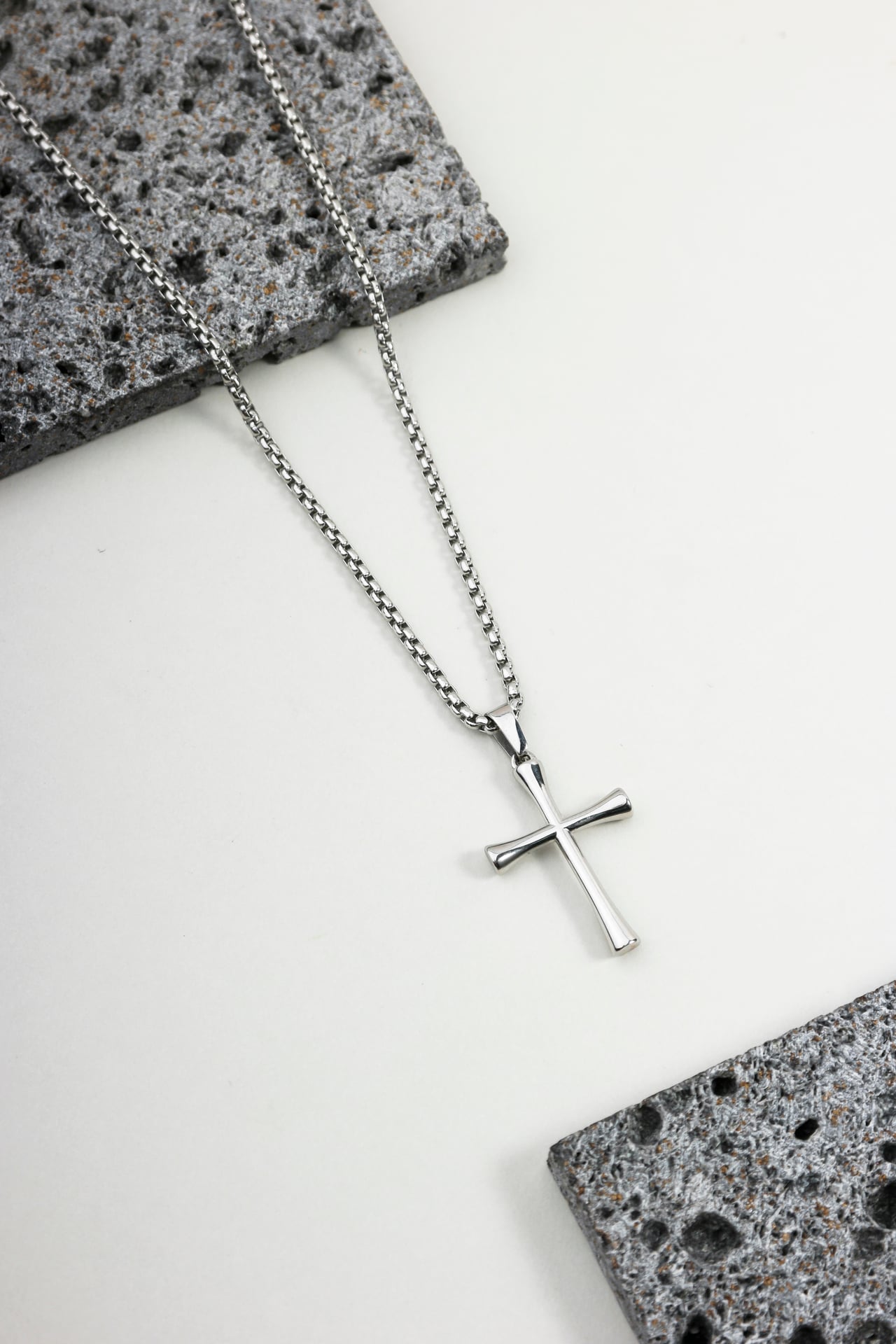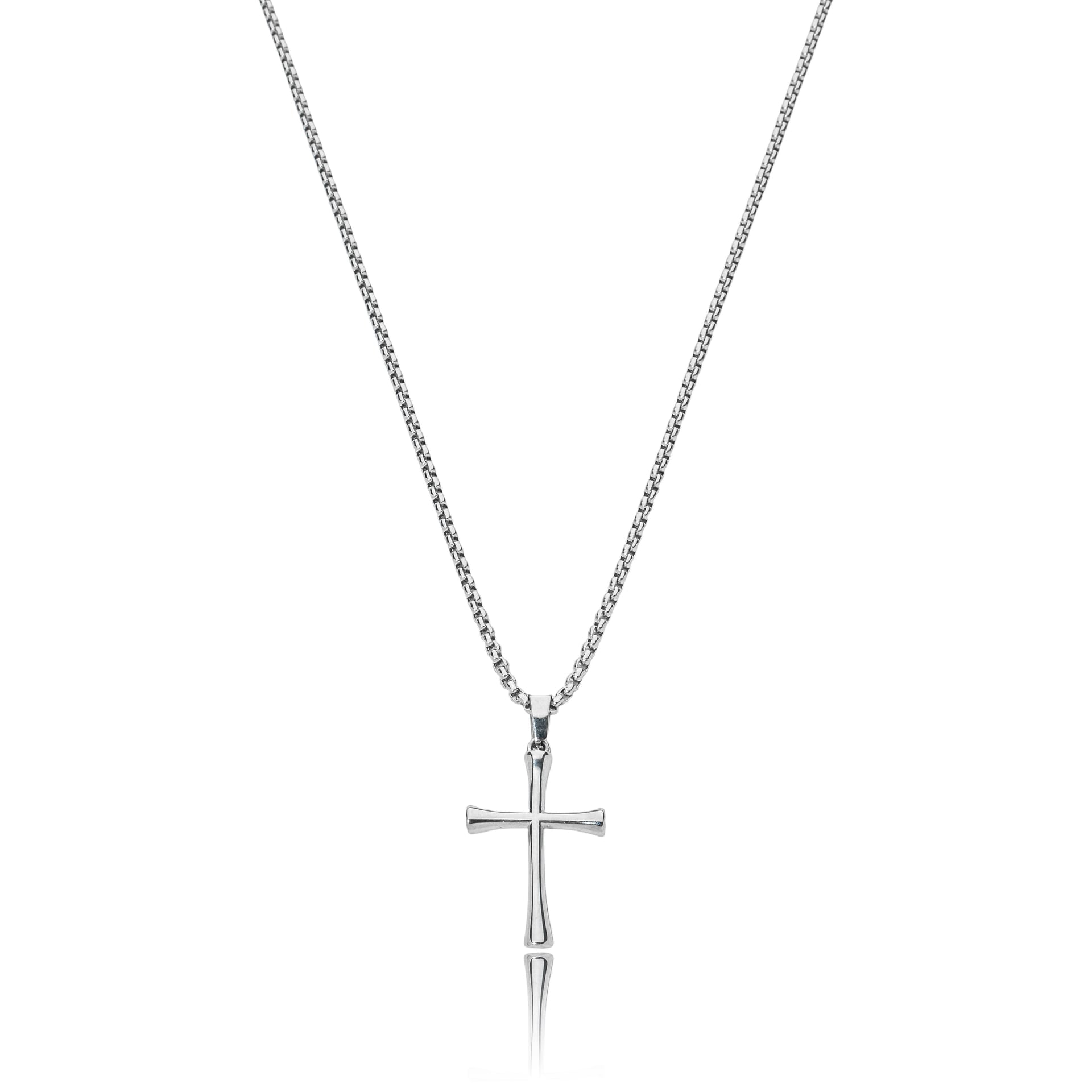 A elegância de um clássico com um toque de design contemporâneo. Este colar de cruz se destaca pelo sutil alargar de suas pontas e pela superfície abaulada, detalhes que maximizam o brilho do aço polido e conferem modernidade a este eterno símbolo de fé.
