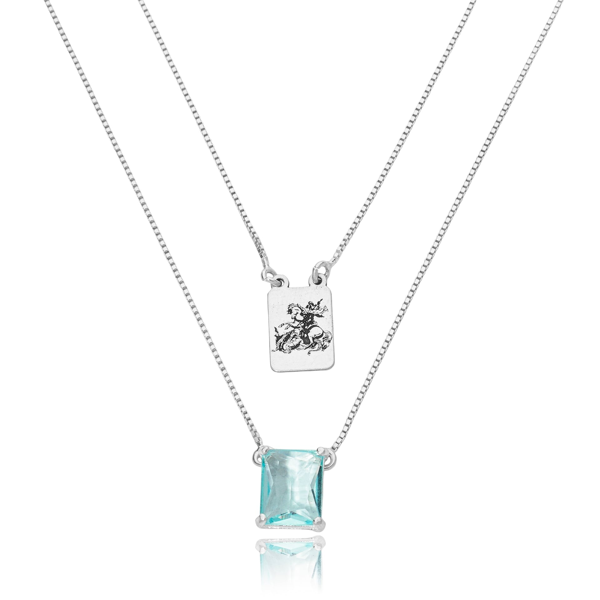 A coragem de São Jorge encontra a serenidade da água marinha. Este escapulário une a força do santo guerreiro, com detalhes oxidados, e a beleza calma da zircônia azul, criando uma joia de equilíbrio perfeito entre proteção e paz.