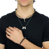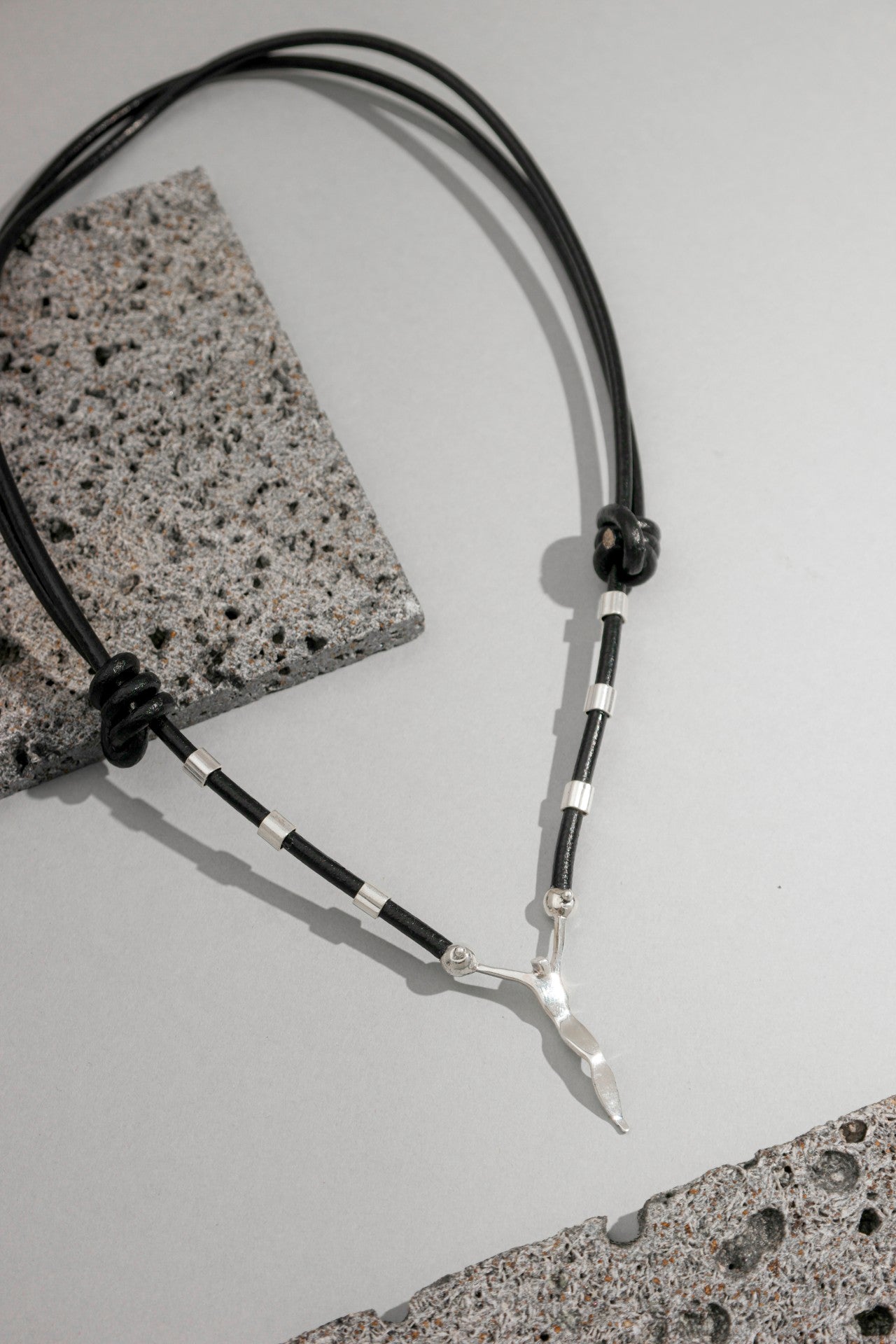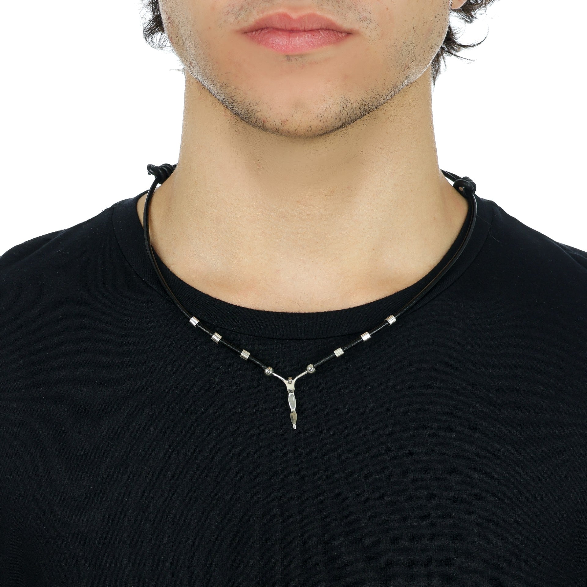 A fusão da rusticidade do couro com a nobreza da prata em um design de fé e versatilidade. Este colar combina a silhueta estilizada de Cristo com seis passadores em prata polida, criando uma peça de estética refinada. Possui nós corrediços que permitem regular o comprimento do colar para qualquer tamanho.